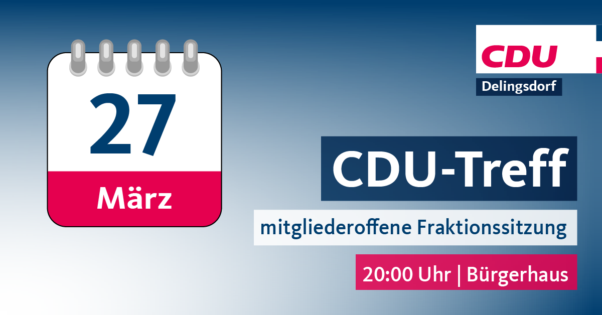 https://www.cdu-delingsdorf.de/termine/1160-cdu-treff-mitgliederoffene-fraktionssitzung Termin 27.03.2023 19:00 Bürgerhaus An der Friedenslinde 3 22941 Delingsdorf zum iCalendar hinzufügen zum Google-Kalender hinzufügen Empfehlen Sie uns!Bei Facebook teilen Bei Twitter (X) teilen Bei Whatsapp teilen Diese Seite drucken Diese Seite einem Freund schicken