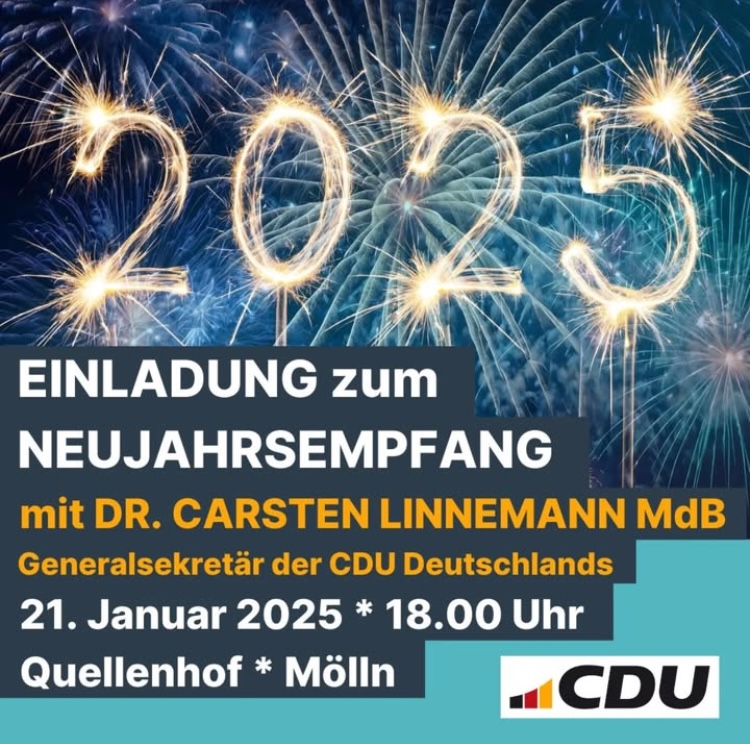 Einladung des CDU Kreisverbandes Herzogtum Lauenburg / CDU Ortsverband Mölln zum Neujahrsempfang mit Dr. Carsten Linnemann. Bei Interesse bitte zwecks Anmeldung melden unter Telefon 04541/803876-0 oderE-Mail: info [at] cdu-herzogtum.de