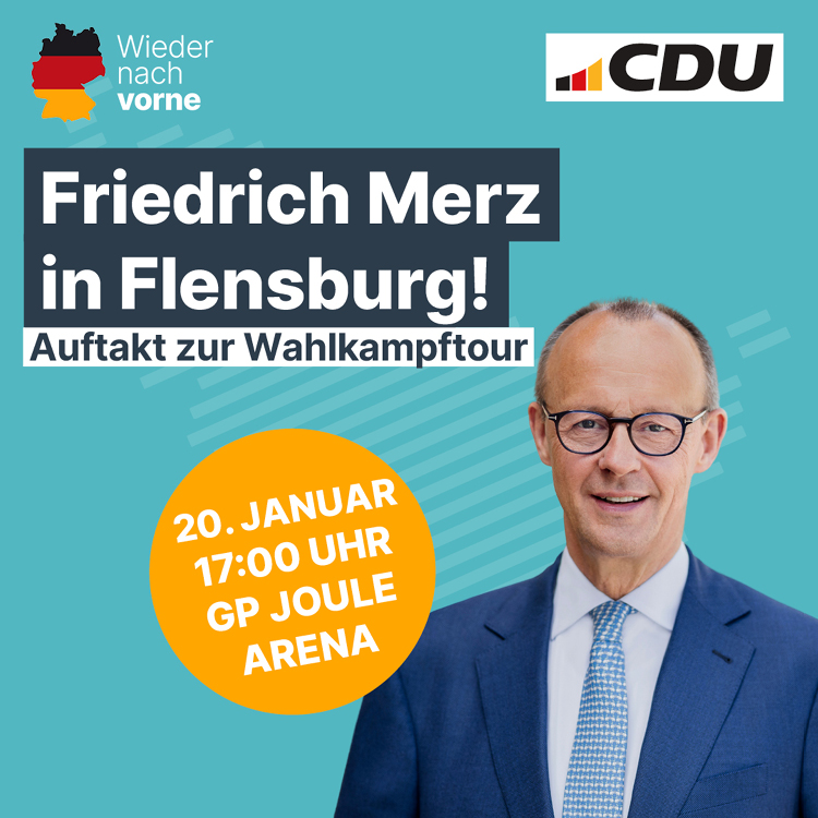 Die Anmeldung erfolgt ausschließlich über den CDU-Bundesverband unter https://wahlkampf-veranstaltungen.cdu.de/anmeldung-flensburg! Bitte beachten Sie: Eine Anmeldung ist zwingend erforderlich, andernfalls kann vor Ort kein Einlass erfolgen.