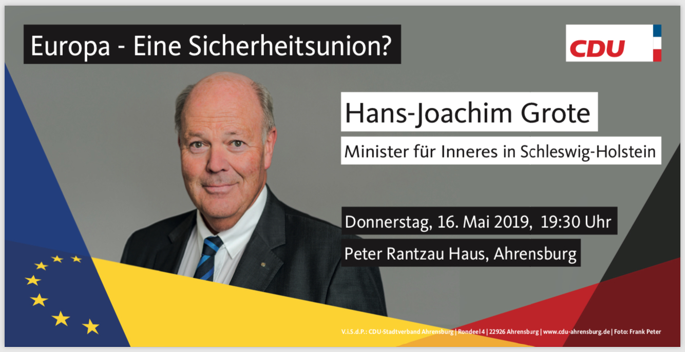 Hans-Joachim Grote, Minister für Inneres in Schleswig-Holstein Termin 16.05.2019 19:30 Peter Rantzau Haus 22926 Ahrensburg zum iCalendar hinzufügen zum Google-Kalender hinzufügen Empfehlen Sie uns!Bei Facebook teilen Bei Twitter (X) teilen Bei Whatsapp teilen Diese Seite drucken Diese Seite einem Freund schicken