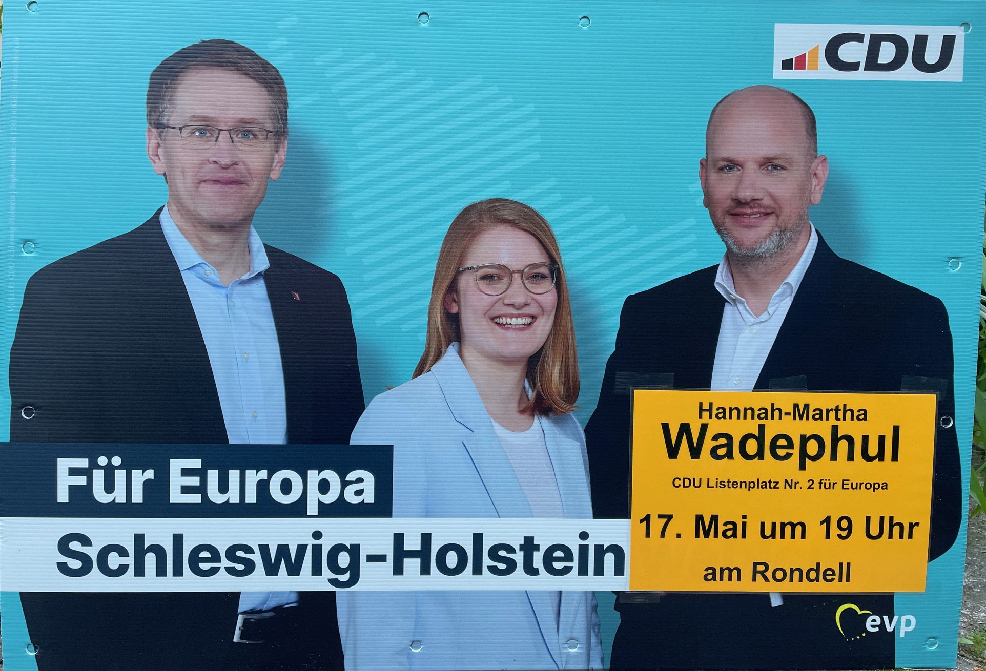 Wir laden Sie herzlich ein: Am 17. Mai um 19 Uhr kommt die Listenkandidatin Nr. 2 der CDU Schleswig-Holsteins, Hannah Wadephul nach Ahrensburg. Auf dem Rondeel haben Sie die Gelegenheit, unsere Kandidatin kennenzulernen und mit uns über die Europwahlen ins Gespräch zu kommen.
