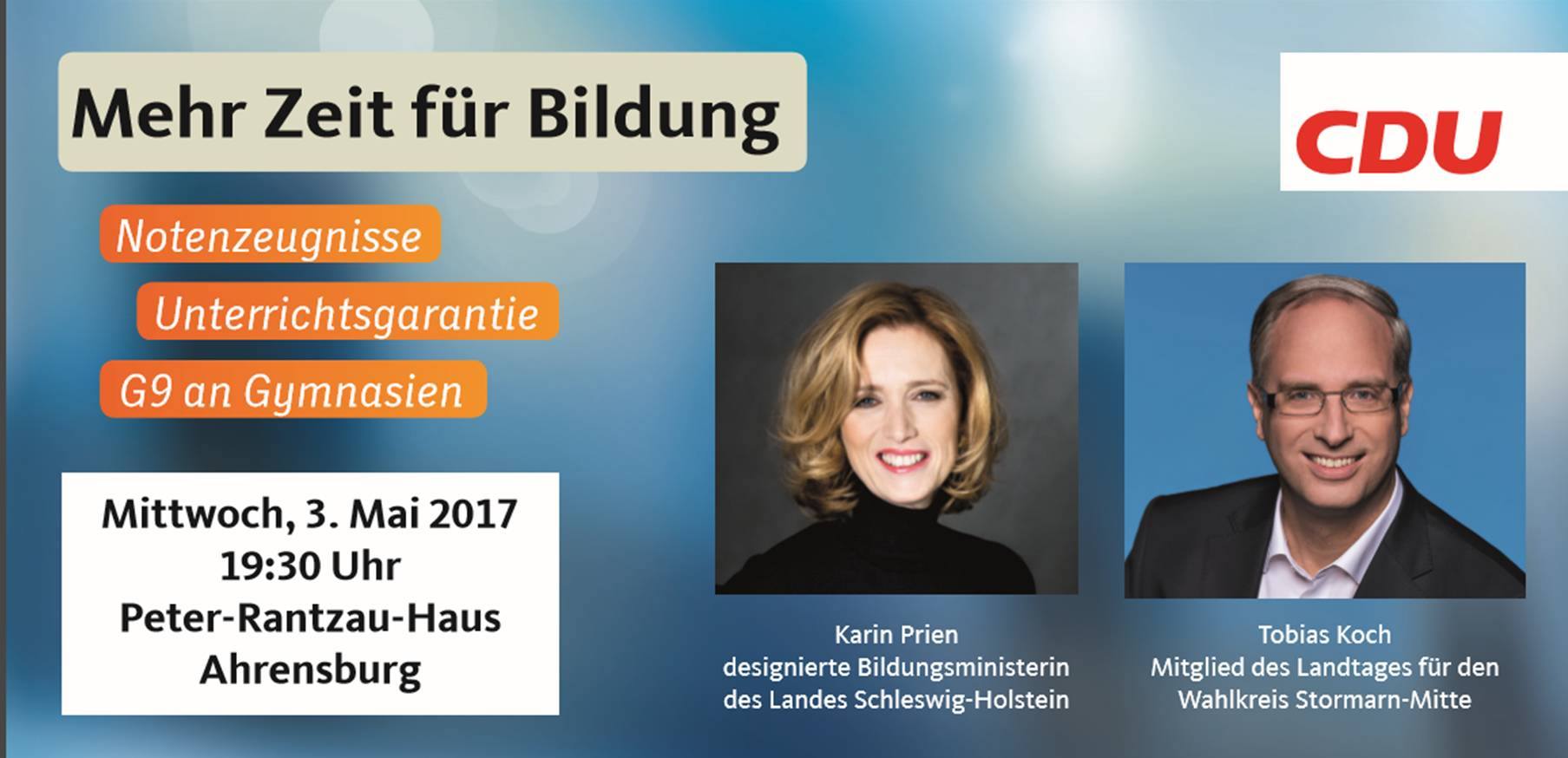 Sie sind herzlich eingeladen mit dem Landtagsabgeordneten für Stormarn Mitte, Tobias Koch (CDU), und der designierten CDU-Bildungsministerin, Karin Prien, über das Thema Bildung zu diskutieren.
