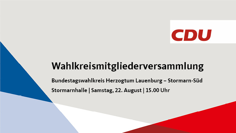 In Vorbereitung der Bundestagswahl 2021 findet die Wahlkreismitgliederversammlung zur Aufstellung einer Wahlkreisbewerberin/eines Wahlkreisbewerbers für den Bundestagswahlkreis 10 Herzogtum Lauenburg – Stormarn-Süd am Samstag, 22. August 2020, 15.00 Uhr in der Stormarnhalle, Am Bürgerpark 4, 23843 Bad Oldesloe, statt.